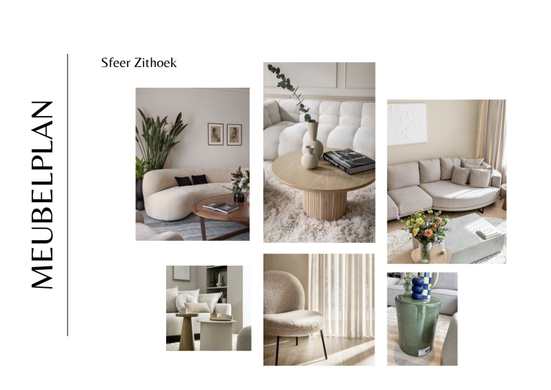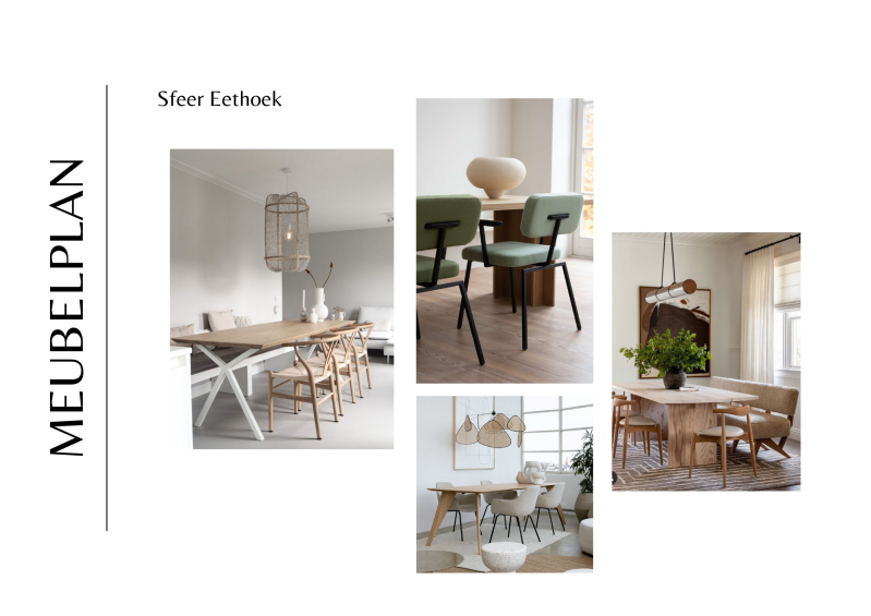 Op basis van het moodboard en de indeling werkte ik volgens het advies uit over welke meubels voor de zithoek en eethoek geschikt zijn binnen de style en budget van de klanten.