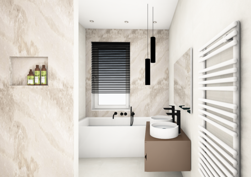 Voor een luxe en welnessgevoel in de badkamer is gekozen voor een lichte marmerlook tegel en houten badmeubel. De zwarte accenten maken de ruimte stoer. Naast de grote stortdouche, komt er een ligbad met whirlpoolfunctie.